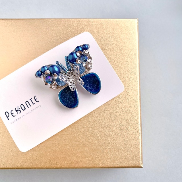 澄んだイメージのシルバーの青い蝶 ワイヤーで作った蝶の羽に 輝きの美しいサファイヤ色のクリスタルを中心に パール、ビーズ、メタルパーツなど 様々な青色とシルバーのパーツを パズルのように組み合わせて制作しています。 蝶にとまるシルバーの小さな蝶が 可愛さをグッと引き出すワンポイントになっています。 大人気の幸せを運ぶ蝶 今までは大ぶりデザインのみの販売でしたが 耳の小さい方や小ぶりが好きな方でも楽しんでいただけるよう 小さめで耳たぶに収まる大きさのデザインにしました。 青色はクールさ、神秘的、穏やかさを感じさせる色で、セロトニン(幸せホルモン)を分泌させ、興奮を沈め落ち着かせる効果もあるそうです。 青い蝶はブルベさんや青好きな方にとってもオススメな色です。 *オススメコーデ* 結婚式の二次会やお呼ばれなどのドレスワンピースを着るような場面や、演奏会にピッタリなデザインです。 また、女性らしいエレガントなコーディネートでしたら普段使いにも違和感なく合わせていただけるかと思います。 ゴールドとシルバーは少し違うデザインになっていますので、色違いでお楽しみいただけるシリーズです。 ▼赤い蝶 https://pesante.base.shop/items/85989789 ▼金具について https://minne.com/items/37648497 ご購入前に☟ https://pesante.base.shop/p/00001 【金具】 ネジバネ式イヤリング/スタッドピアス 【サイズ】 全長:約7cm/耳下:約4.5cm 【重さ】 片耳:約3.5g(内金具重量:約1.2g) ※1円玉1g(1円玉約3.5枚分)