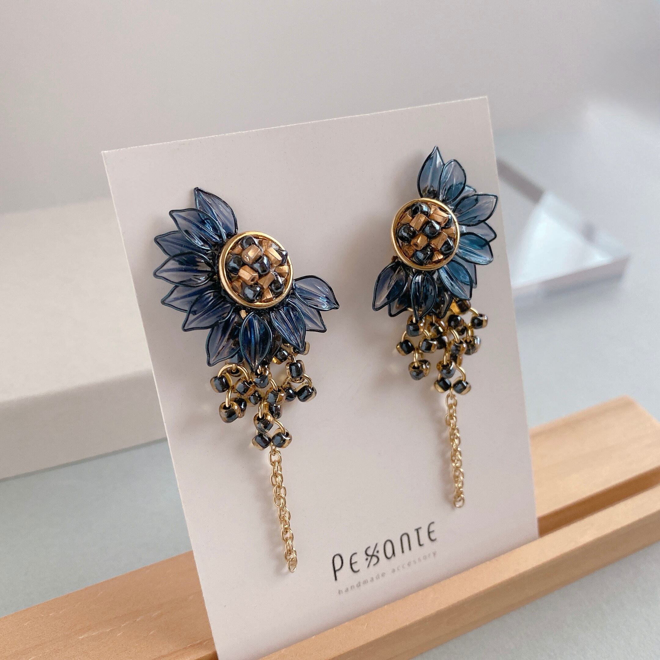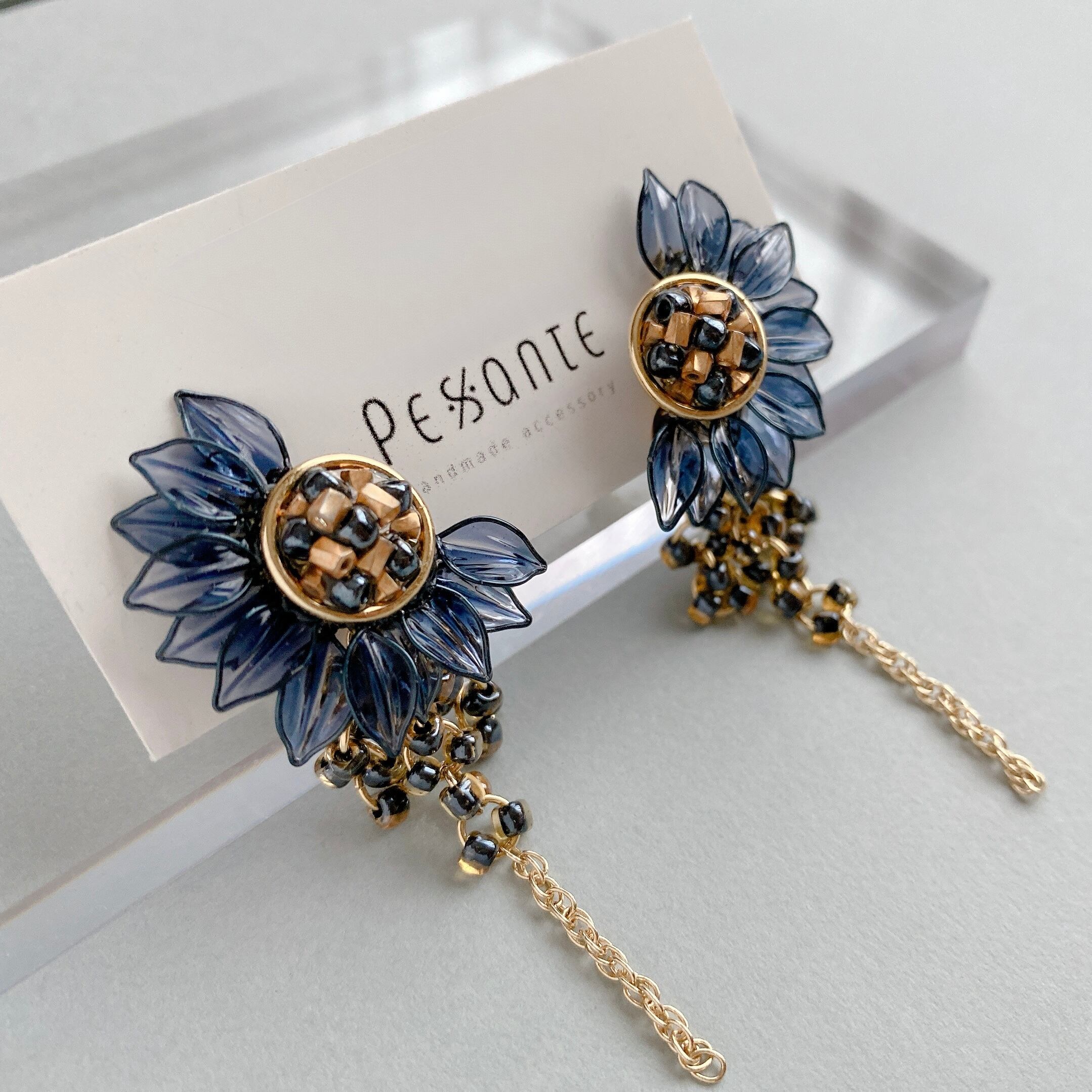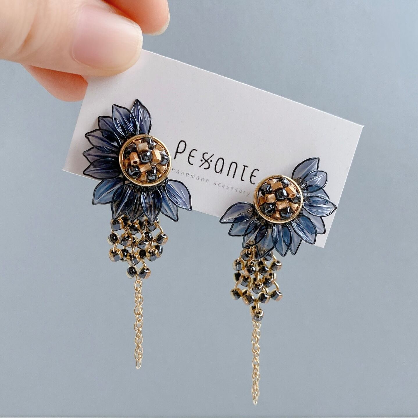 ヘマタイトカラーの少し青みがかった一本のワイヤーから6枚の花びらを制作し、奥行きを出すために同じものを重ねて、12枚の花びらでハーフタイプのひまわりを咲かせています。