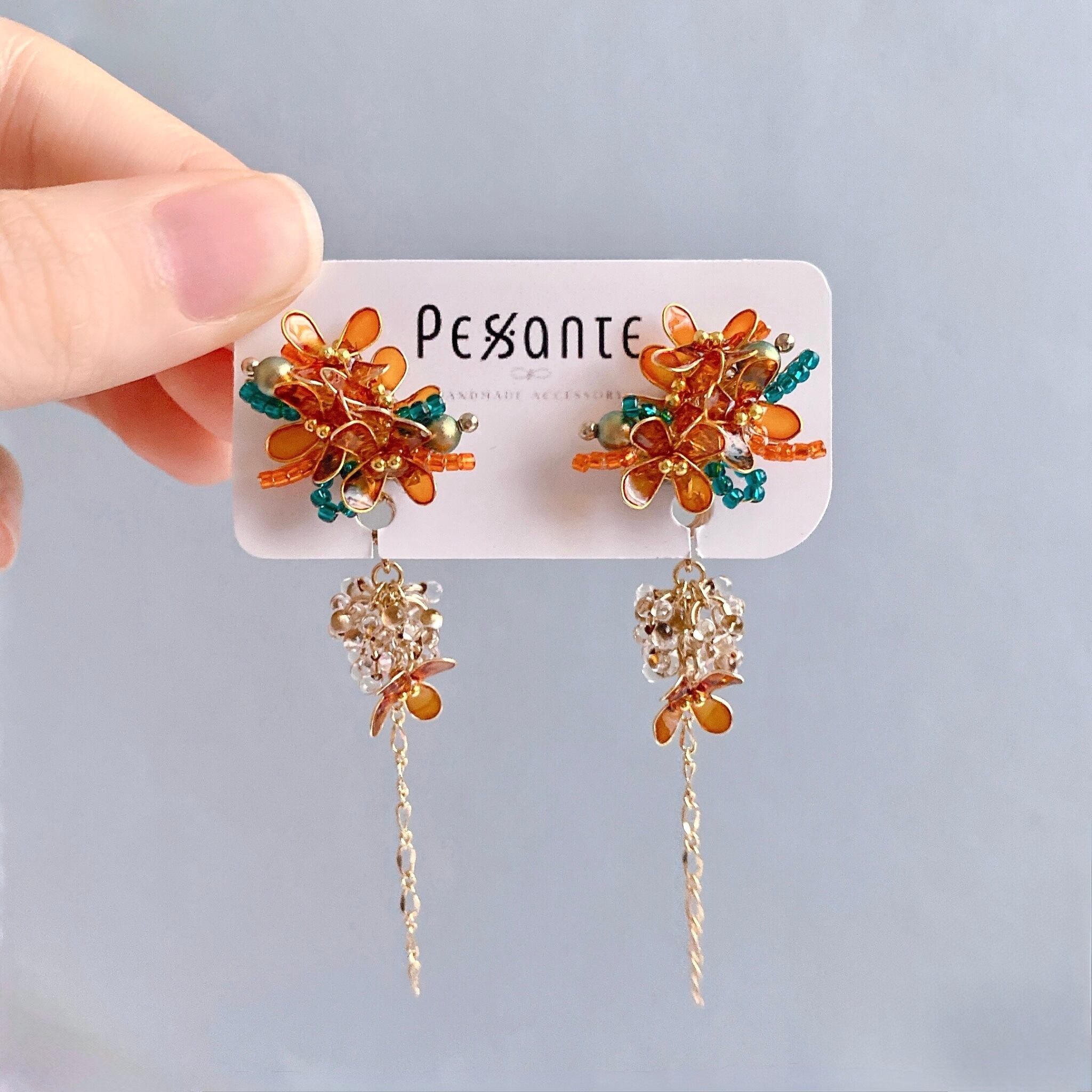 耳下には風に揺れる金木犀のように、可愛らしさと透明感の美しいファルファーレビーズ、そして1輪のお花をそっと添えて、セピア色になっていくどこか寂しさを感じられる秋を華やかに彩ってくれるデザインに仕立てました。