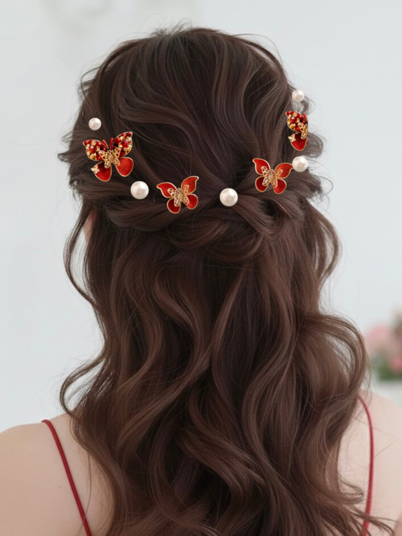 華やかで美しい赤色の蝶と、サンタンカと言う小さな小花を合わせた髪飾りです。