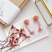 不滅の幸運を象徴する小さな白珊瑚とピンクの梅の花がかわいい春らしいイヤリングです。