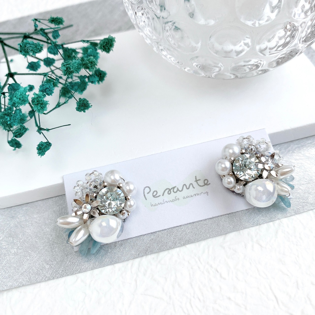 真っ白で光る雪のようなアメリカ製のティアドロップ型のガラスビーズやパール、クリスタルなどを使用してギュッと詰まったブーケのようなデザインにしました。