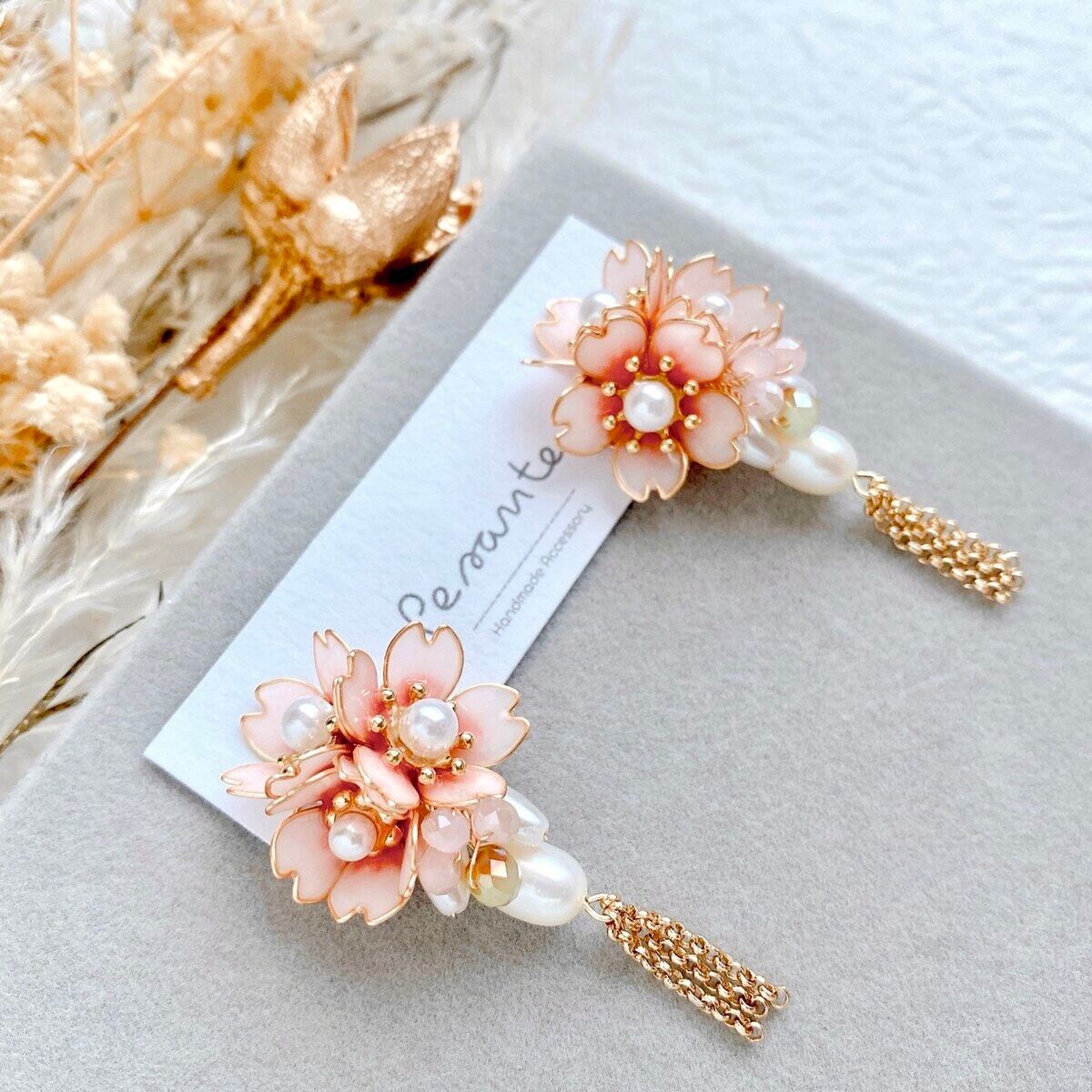 日本の国花「桜」をワイヤー、ディップ液、レジン液を使用して耳飾りを制作しました。
